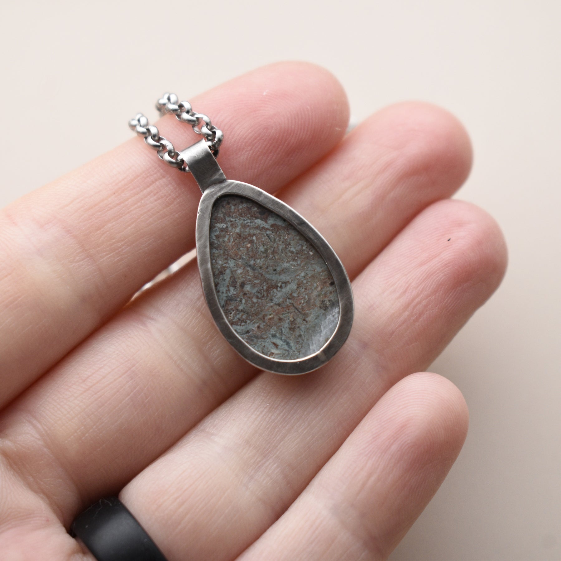 This unique Blue Stone pendant necklace for women is handmade in solid sterling silver. The stone was collected from a beach in Washington State and then made into this necklace. All stone and metal work was done by Woodland Metalsmith.