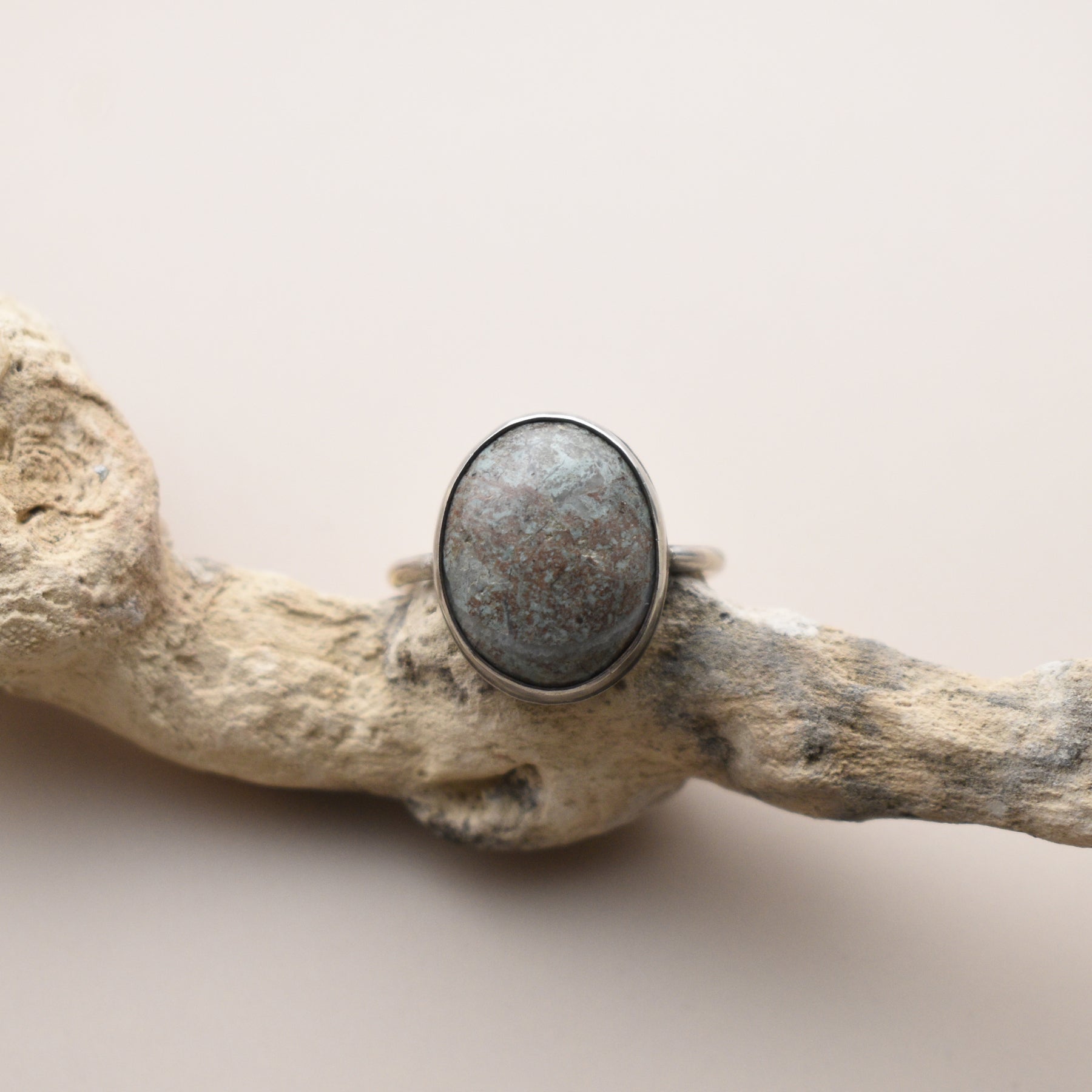 This unique Blue Stone ring is handcrafted in solid sterling silver on a fitted band. The stone was collected from a beach in Washington State and then made into this ring. All stone and metal work was done by Woodland Metalsmith.