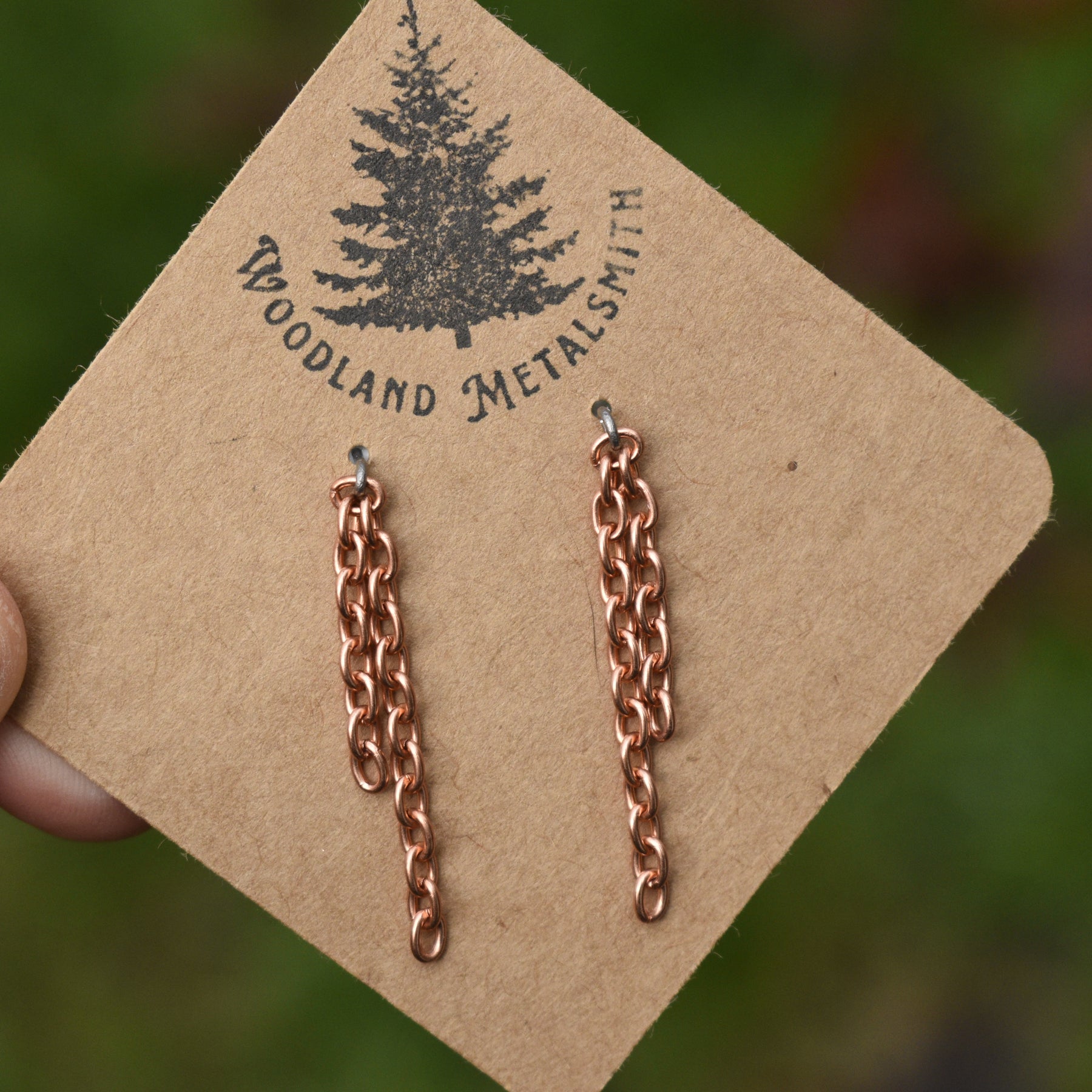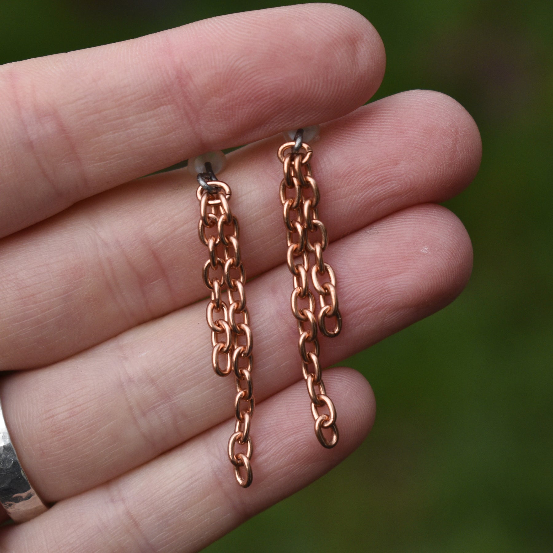 These limited edition chain stud earrings for women are handcrafted with pure copper chain on hypoallergenic niobium posts.