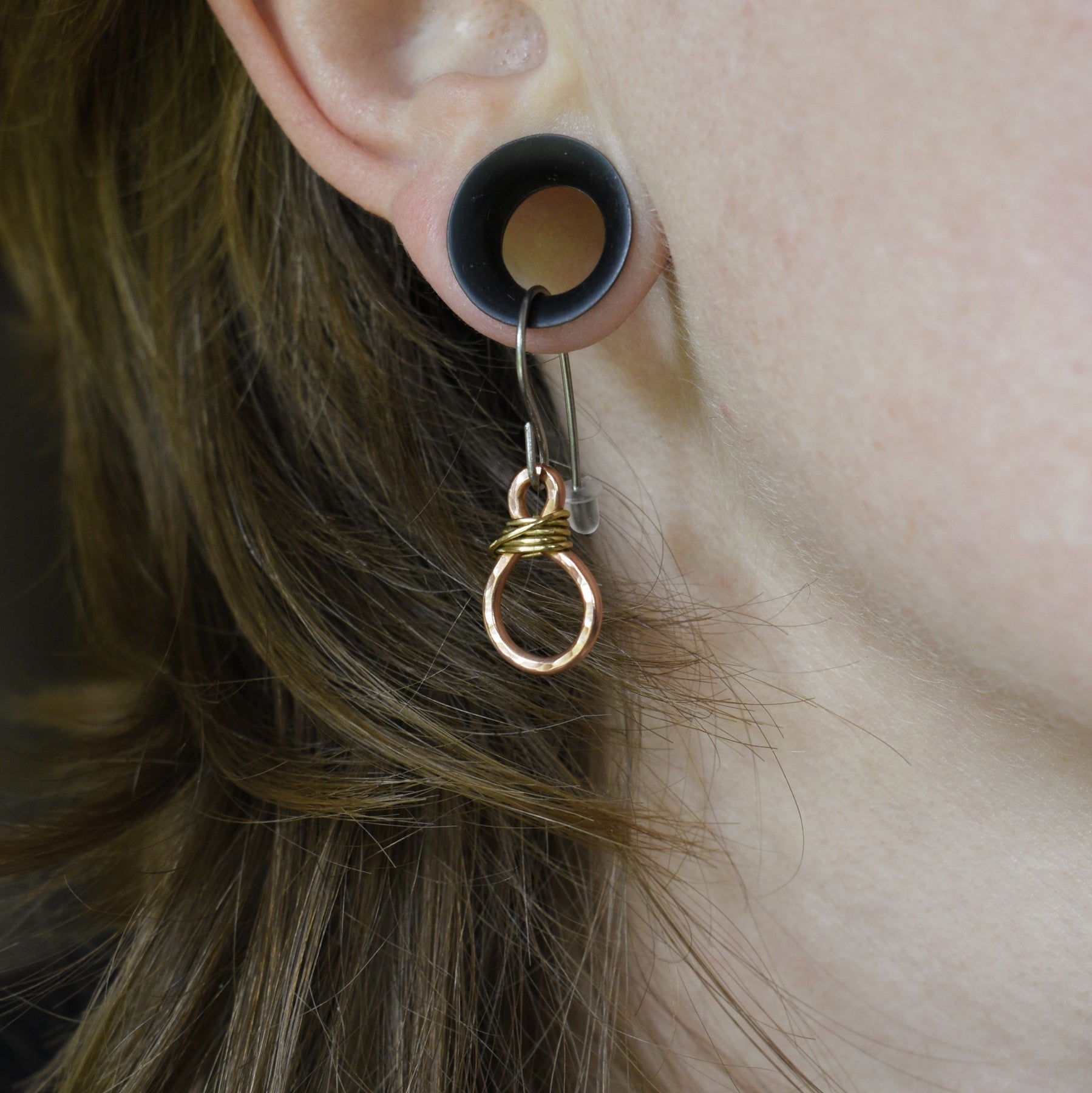 These dainty mixed-metal earrings for her are handcrafted with pure copper and brass on hypoallergenic titanium hooks. Small batch made and limited in stock.