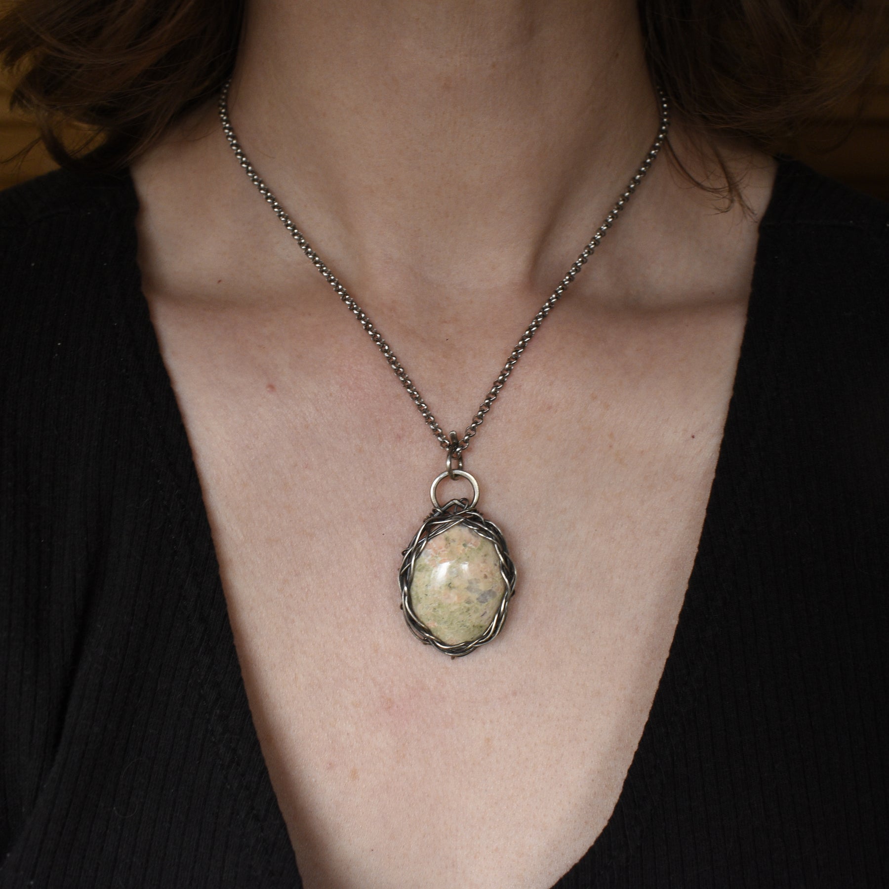 This unique Epidote and Orange Calcite pendant necklace is wire wrapped in sterling silver. Ā The stone was collected from a beach in Washington State and then made into this necklace. All stone and metal work was done by Woodland Metalsmith.