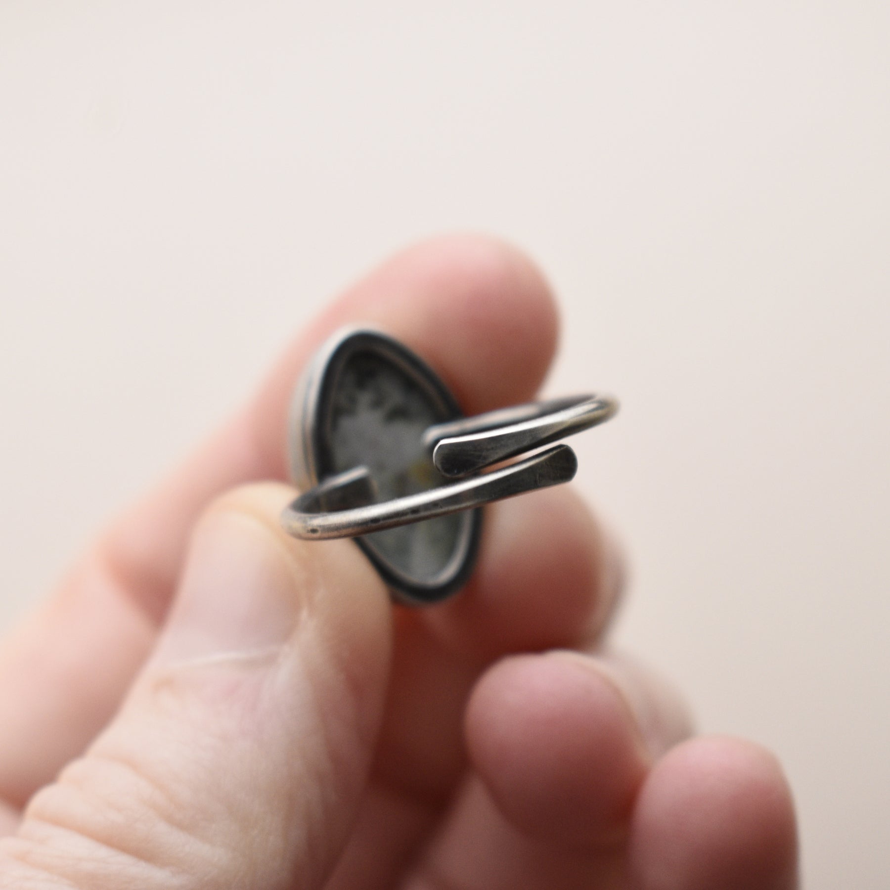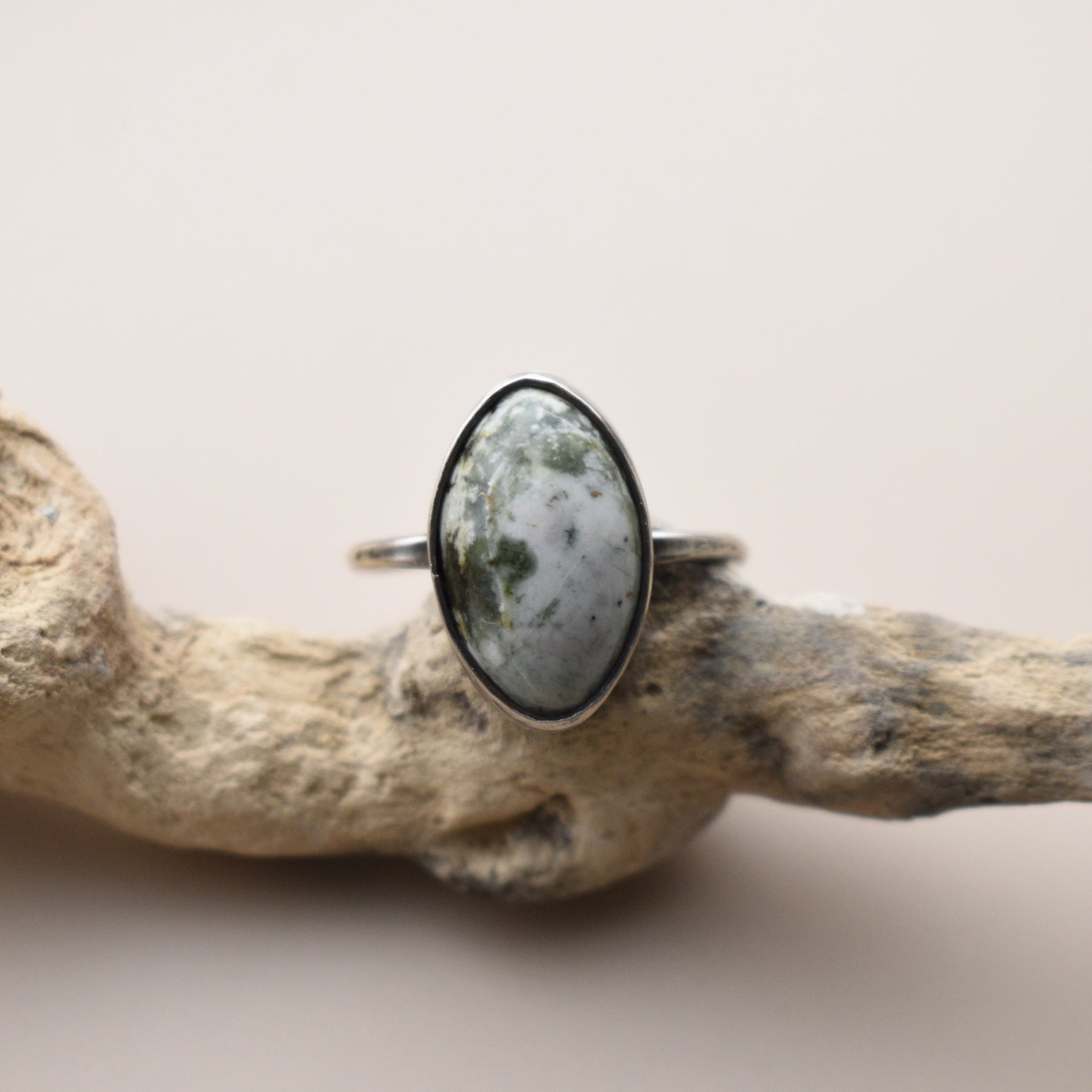 This green and white Jasper ring is handcrafted in solid sterling silver on an adjustable band. The Jasper was collected from a beach in Washington State and then made into a ring. All stone and metal work was done by Woodland Metalsmith.