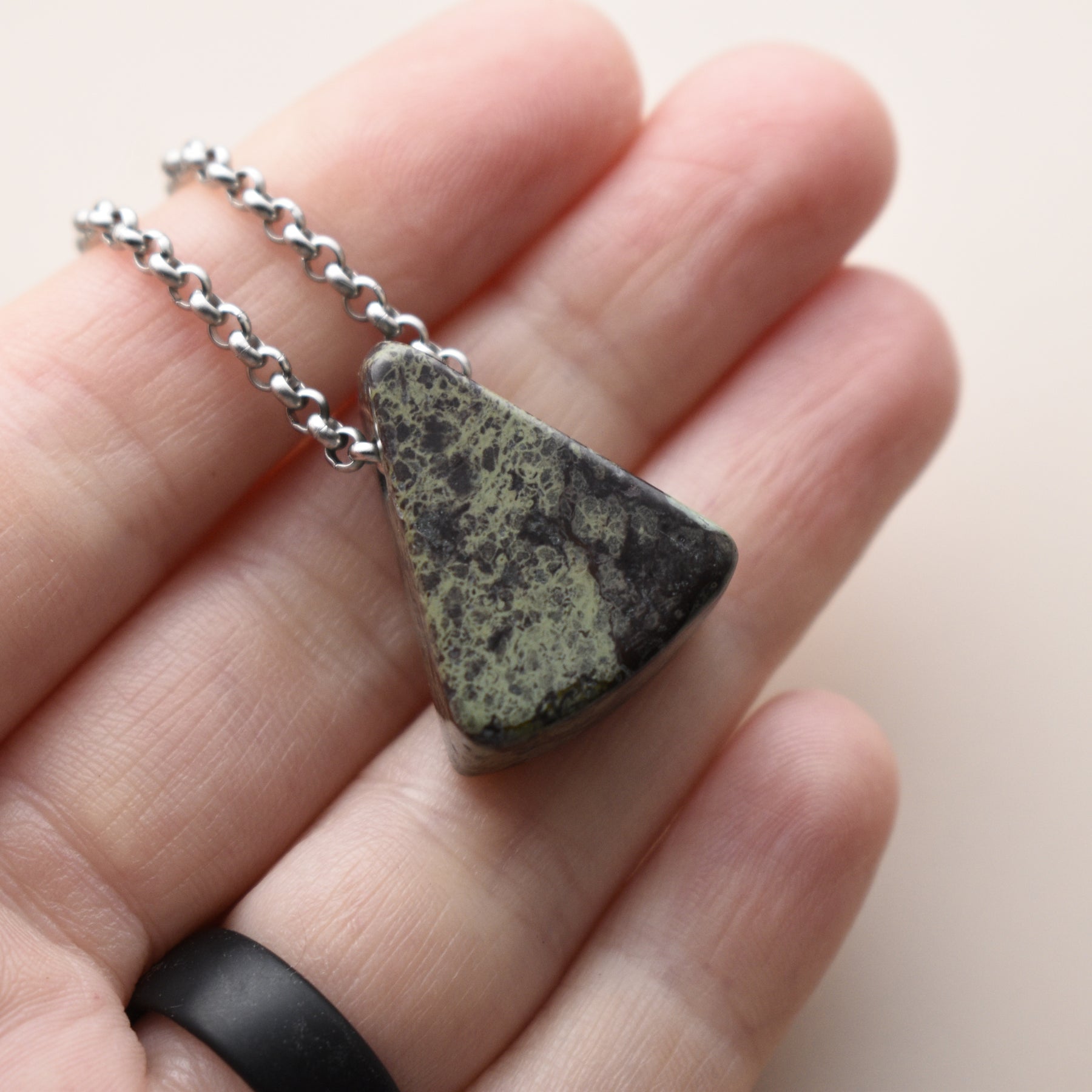 This green and purple Jasper pendant necklace for men and women is completely handmade! The Jasper was collected from a beach in Washington State and then made into this necklace. All stone work was done by Woodland Metalsmith.
