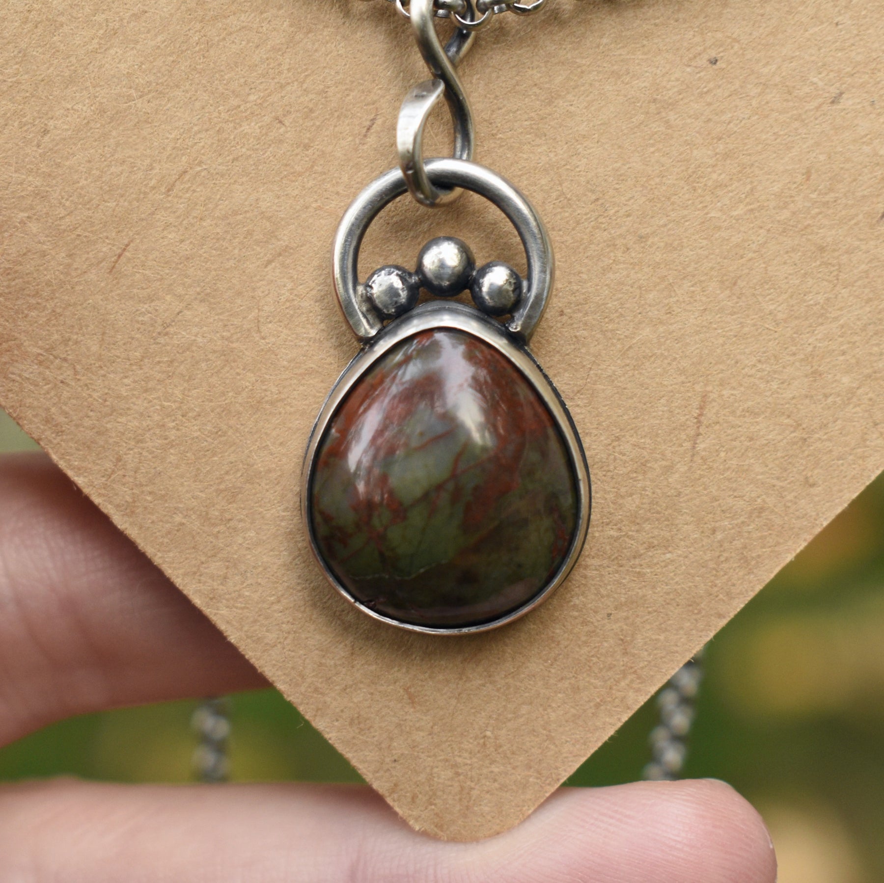 This unique Moss Agate /Jasper pendant necklace is handmade in solid sterling silver. I hand picked the Agate from a beach in Washington State and then made it into this necklace. All stone and metal work was done by Woodland Metalsmith.