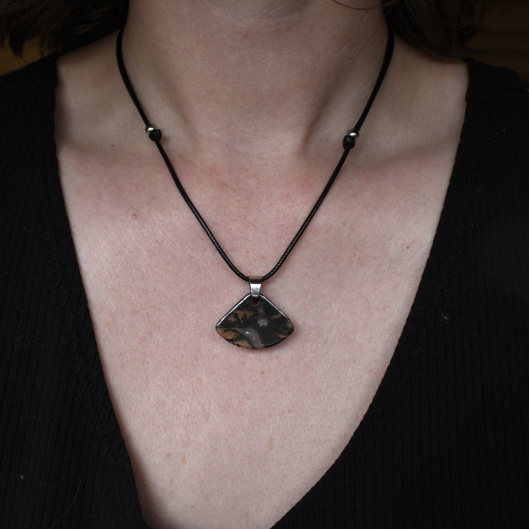 Oregon Moss Agate pendant necklaces for men and women on adjustable black cords. These are handmade in small batches, from cutting the stone to hanging it on the bail. Choose a pendant from the current batch!