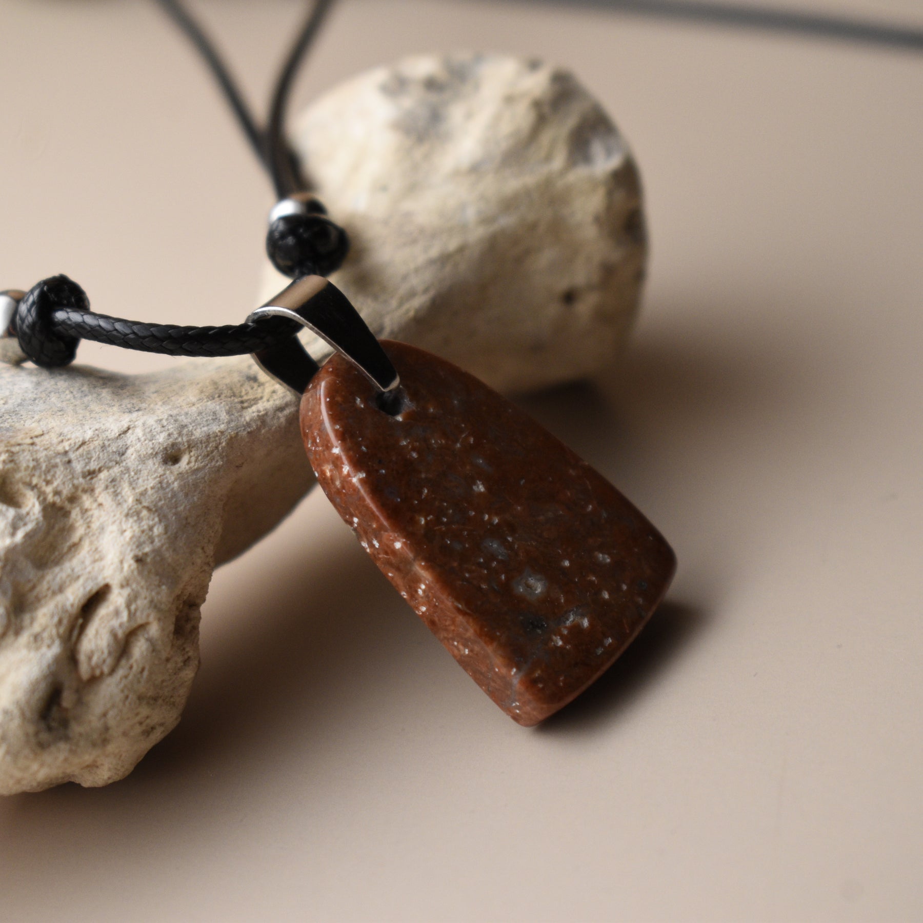 This unique orangeĀ JasperĀ pendant necklace is handmade with a solid 304 stainless steel bail.Ā The Jasper was collected from a beach in Washington State and then made into this necklace. All stone and metal work was done by Woodland Metalsmith.