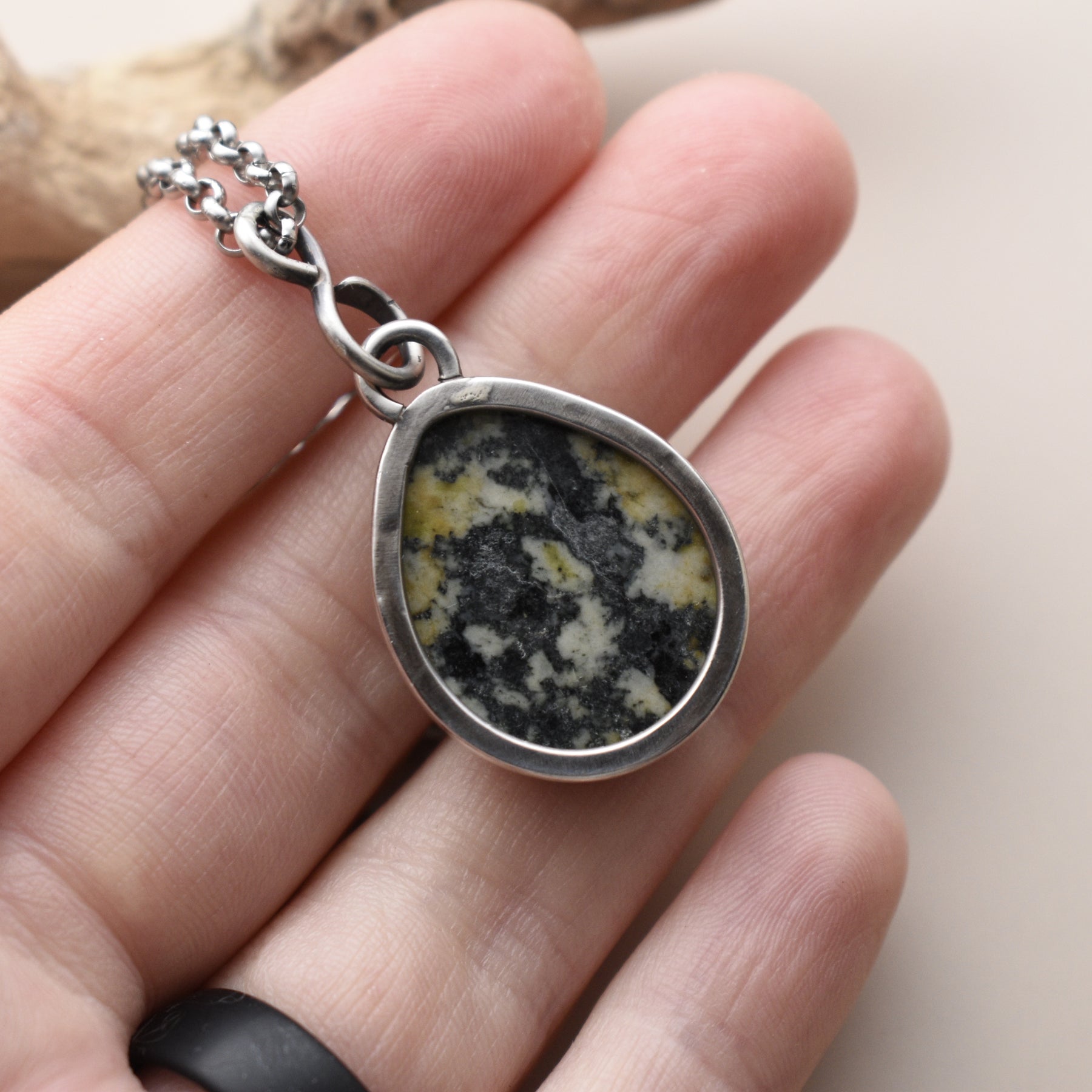This moody Orthoclase and Black Tourmaline pendant necklace for men and women is set in solid sterling silver. The stone was collected from a beach in Washington State and then made into this necklace. All stone and metal work was done by Woodland Metalsmith.