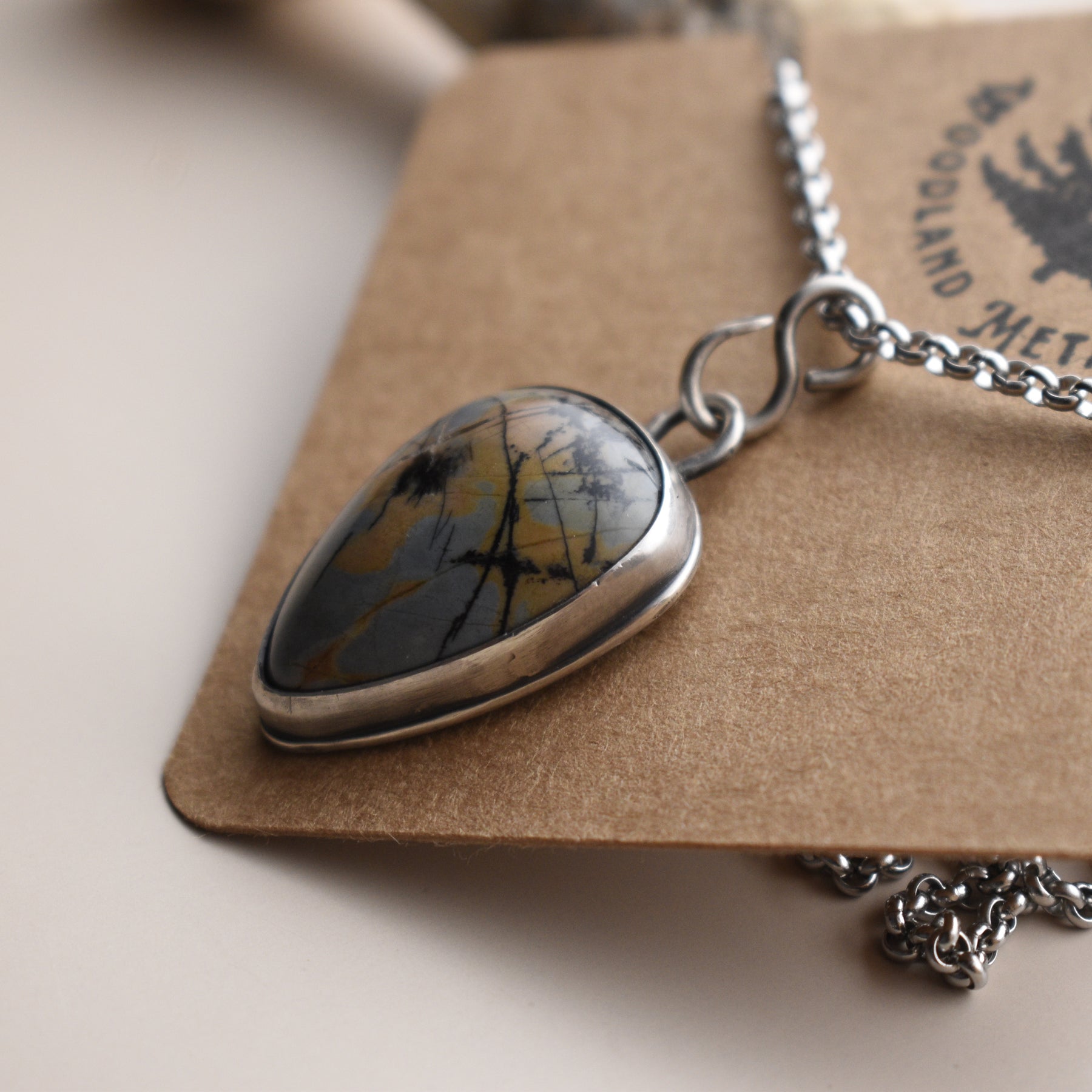 This unique blue and beige Porcelain JasperĀ pendant necklace is handmade in solidĀ sterling silver. Ā The Jasper was collected from a beach in Washington State and then made into this necklace. All stone and metal work was done by Woodland Metalsmith.