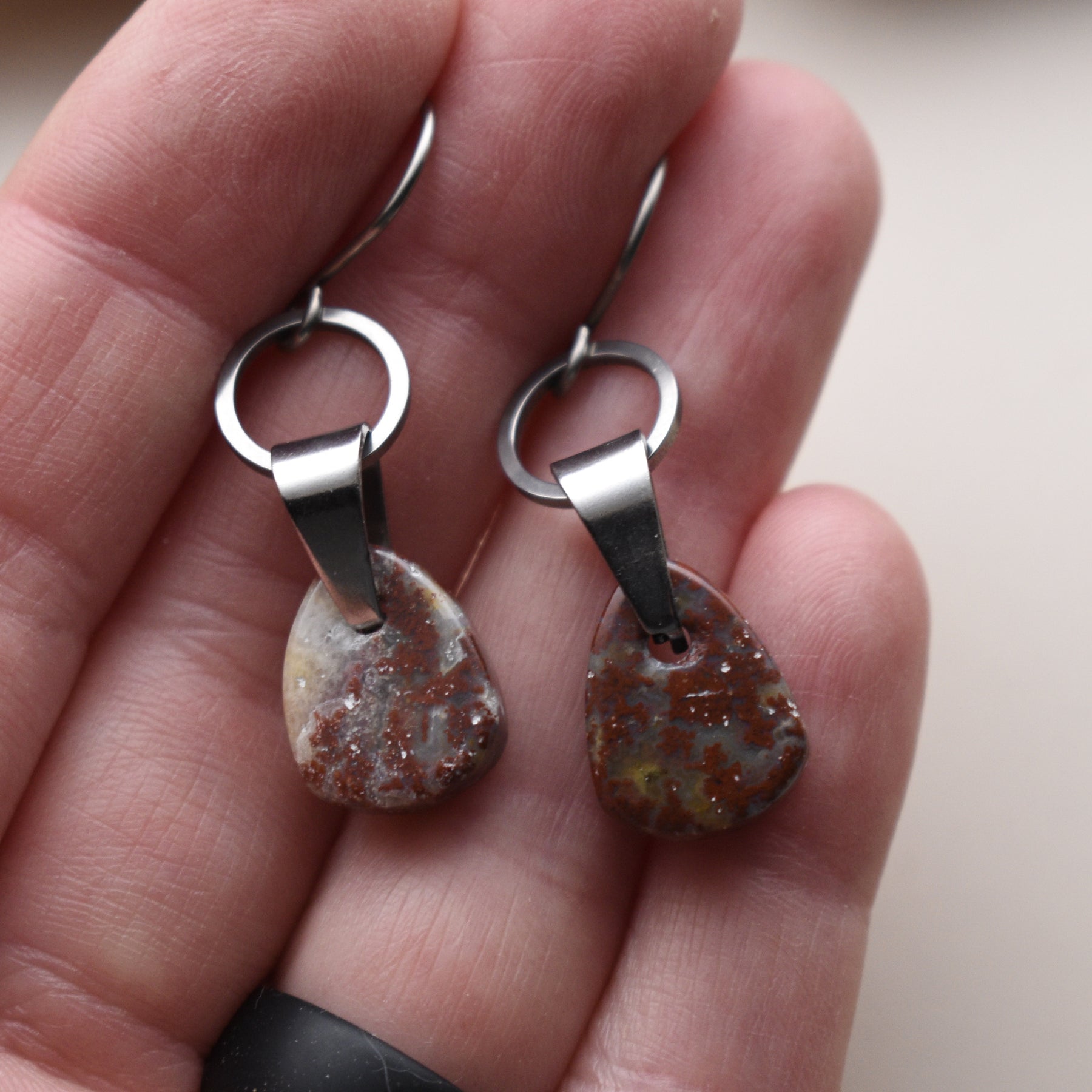 These red and white Jasper earrings for women are handcrafted with solid 304 stainless steel on hypoallergenic titanium hooks. The Jasper was collected from a beach in Washington State and then made into earrings. All stone and metal work was done by Woodland Metalsmith.