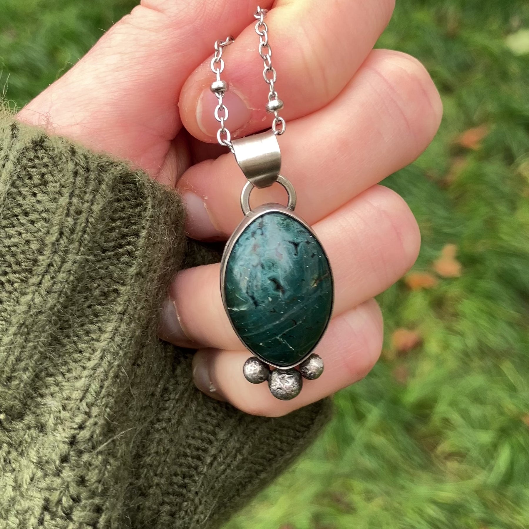 This glittery Blue Jasper pendant necklace is handmade in solid sterling silver on a durable 16 inch satellite chain. Swap the chain out for a different size or style here.