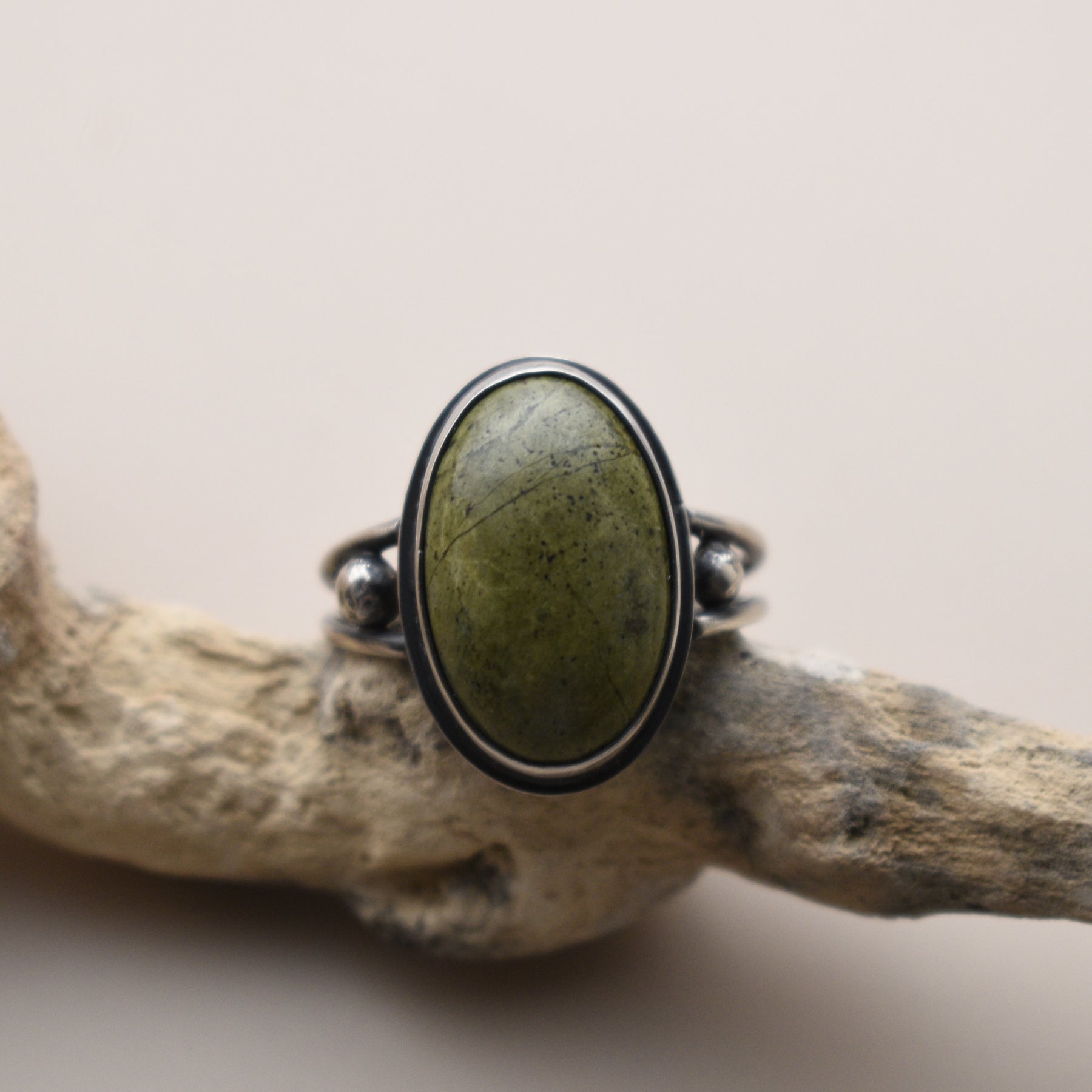 This beautiful Epidote ring is handcrafted in solid sterling silver on a size 8 band. I collected the Epidote on a beach in Washington and then I cut and polished it, making it into a ring. All stone and metal work was done by Woodland Metalsmith.