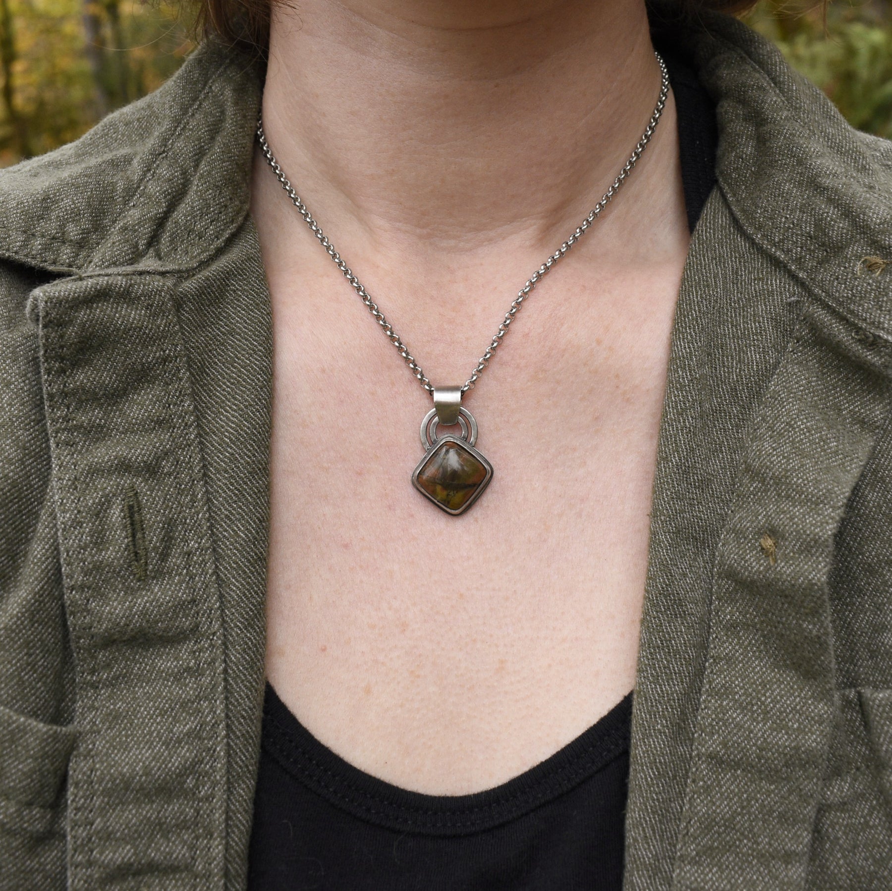 This multicolored Orange and Black Jasper pendant necklace is handmade in solid sterling silver.  The Jasper was collected from a beach in Washington State and then made into this necklace. All stone and metal work was done by Woodland Metalsmith.