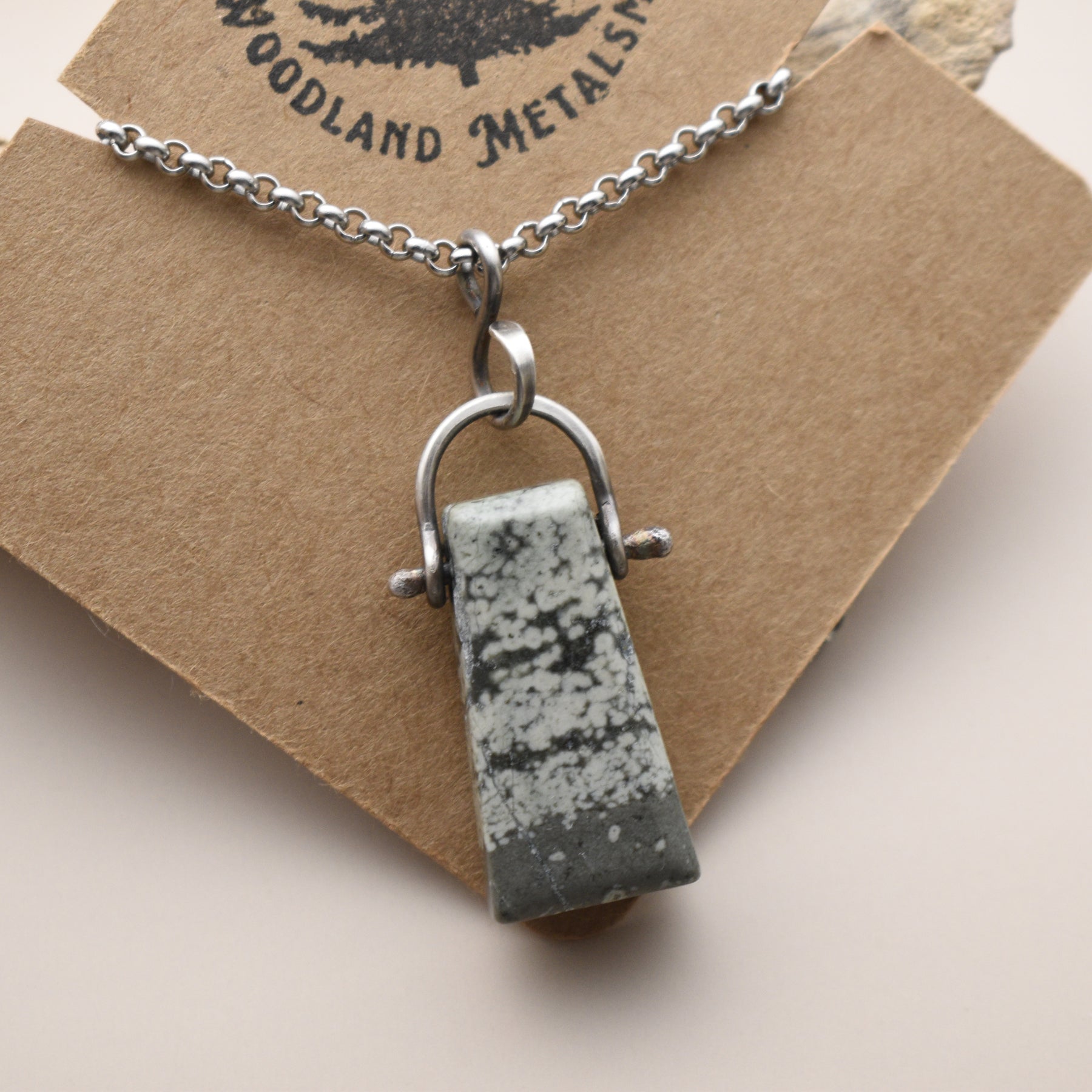 This unique Variolite pendant necklace for men and women is handmade with sterling silver. The Variolite was collected from a beach in Washington State and then made into this necklace. All stone and metal work was done by Woodland Metalsmith.