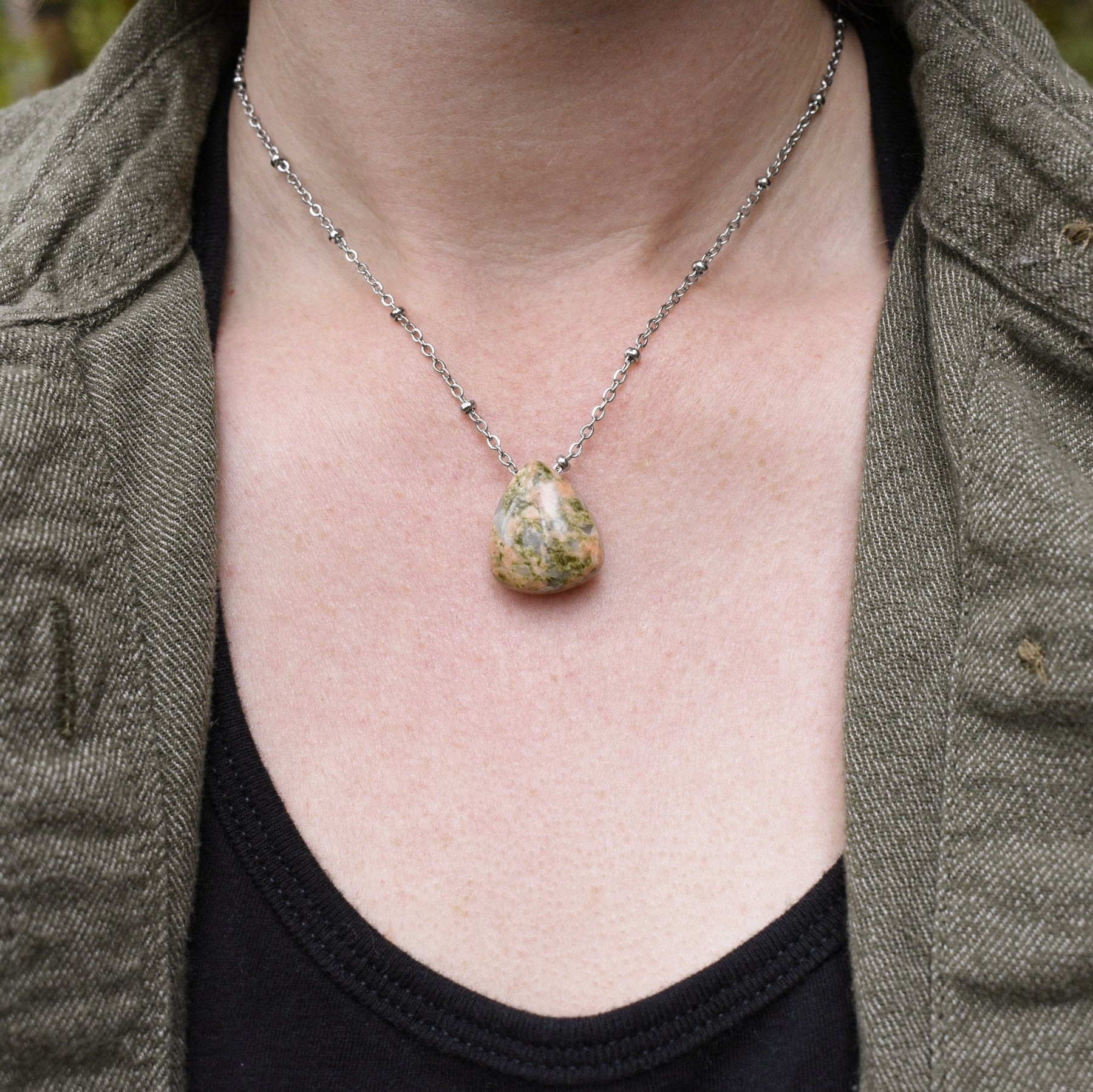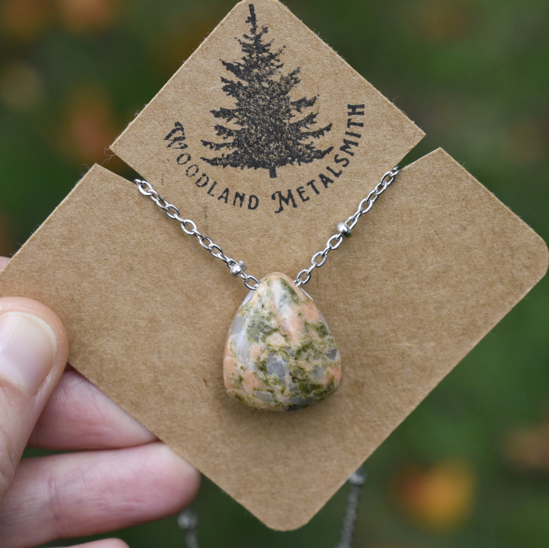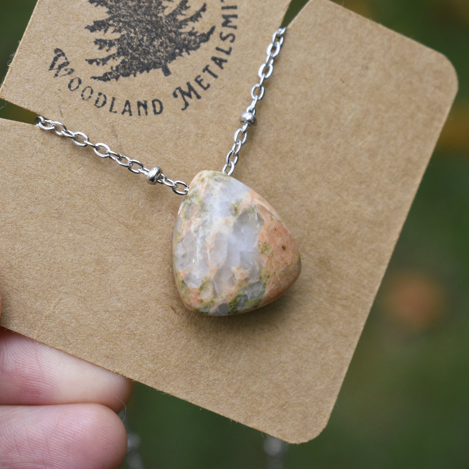 This beautiful Unakite pendant necklace is reversible and handmade! The Unakite was collected from a beach in Washington State and then made into this necklace. All stone work was done by Woodland Metalsmith.