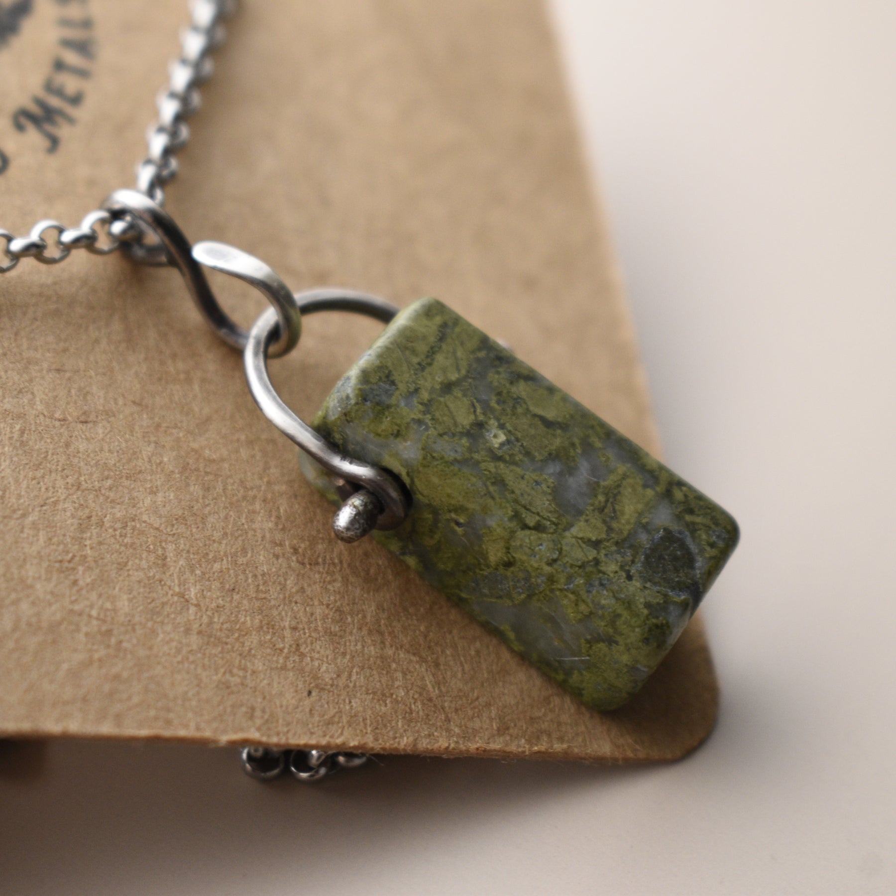 This unique green Epidote pendant necklace for men and women is handmade with sterling silver. The Epidote was collected from a beach in Washington State and then made into this necklace. All stone and metal work was done by Woodland Metalsmith.